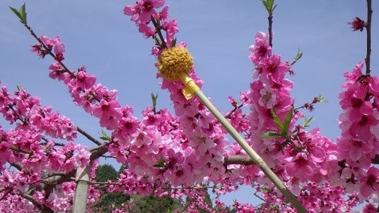 桃の花が咲く4月初め、桃畑が一面桃色に染まる中、人工授粉を行います。桃の中には花粉を持たない品種があり、花粉を持つ別の品種の樹から採取した花粉を、こうして人工的に受粉することで、安定して桃をならせることができます。