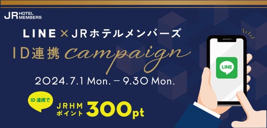 LINEでの会員証の提供開始に伴い、2024年7月1日(月)~9月30日(月)の期間、「LINE×JRホテルメンバーズ ID連携キャンペーン」を実施いたします。キャンペーン期間中にLINE ID連携していただいたJRホテルメンバーズ会員さま(新規入会含む)を対象に、もれなくJRホテルメンバーズポイント「300pt」をプレゼントいたします。