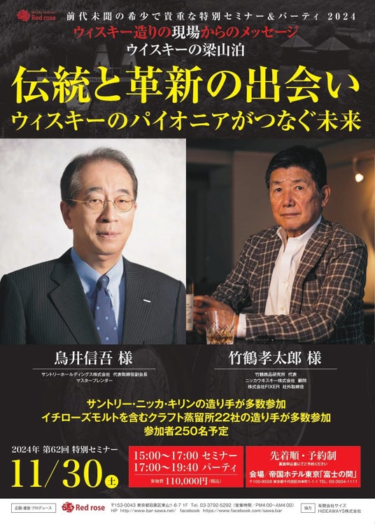 第62回「鳥井信吾氏と竹鶴孝太郎氏 特別セミナー&パーティ」を帝国ホテル 富士の間にて開催いたします。コンセプトはつなぐ「継承」。