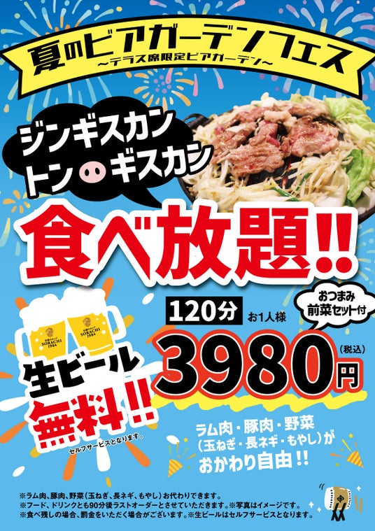 テラス席限定のビアガーデンとなっており、ジンギスカンとトンギスカンをお召し上がりいただけます。生ビール何杯飲んでも無料、おつまみ前菜セット付き、ラム肉・豚肉・野菜(?ねぎ・長ネギ・もやし)がおかわり自由となっております。