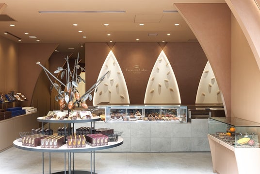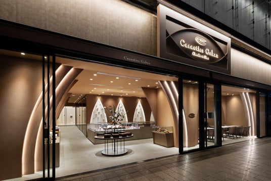 店舗の壁面の壁には、左官職人が仕上げたカカオハスク(カカオ豆の皮)を練り込んだ土壁、彫刻職人が彫り上げたカカオポッド、アイアン職人がつくりあげたカカオツリーが配され、カカオティエゴカンの職人が店内でつくりあげる自家製のチョコレートの香りが店内に広がります。