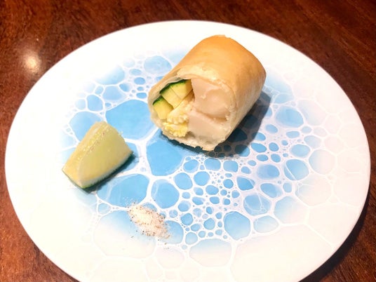さっくりと軽やかな食感の春巻き。中には旬のホタテ、ヤングコーン、ズッキーニが入っています。お好みでライムと山椒塩をかけてご賞味ください。