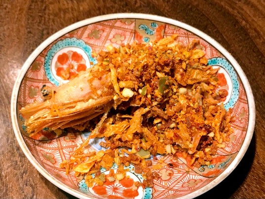 香港の代表的な海鮮料理のひとつ。甘海老を丸ごと素揚げし、フライドガーリックなど十三種の香辛料でまぶしたスパイシーな一品。高温で揚げているため、外側はパリッと身は柔らかく仕上がっています。頭から丸ごとお召し上がりいただけます。