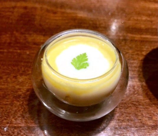 皮蛋豆腐と皮蛋の卵黄と練り胡麻のソース、きゅうり、とうもろこしの組み合わせ。皮蛋独特の臭みは無く、まろやかであっさりとした口当たりです。中には夏の旬野菜・とうもろこしの粒が入っています。