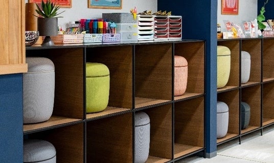Teseraは細くシャープなシルエットのフレームで空間に圧迫感を与えないデザインが特徴です。ドラマ内では、その特徴を生かして階段状のシェルフで空間を緩やかに仕切るよう設置されています。