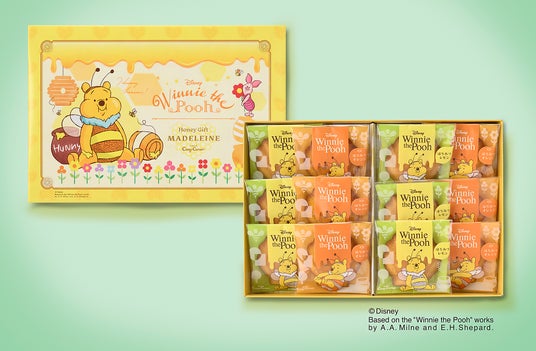 特長:「はち(8)みつ(3)の日」にちなんだ、はちみつのやさしい甘みとレモン、オレンジそれぞれの爽やかな味わいが楽しめる2種類のマドレーヌ。みつばち姿がかわいい「くまのプーさん」を個包装フィルムにデザインし、BOXに詰め合わせました。「はちみつの木」をイメージしたBOXは、上部を引き上げるとプーさんがはちみつに埋もれているように見える仕掛けになっています。癒やしをくれるプーさんとやさしい味わいのスイーツで、ほっこりティータイムを♪