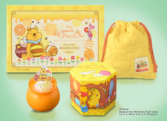 焼菓子ギフトは、はちみつのやさしい甘みに柑橘の爽やかさをプラスした「はちみつレモンマドレーヌ」と「はちみつオレンジマドレーヌ」を、仕掛け付きボックスやアフターユースできる巾着、みつばち姿に扮したプーさんをデザインしたボックスにそれぞれアソートしました。