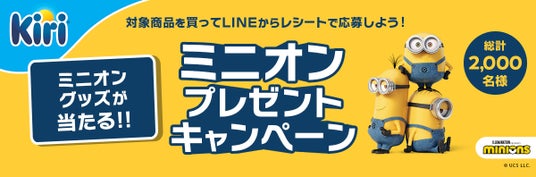 ミニオンのグッズが当たるプレゼントキャンペーンを2024年7月19日(金)~12月25日(水)の期間で実施いたします。対象の「キリ」商品を購入したレシートを撮影し、ミニオン限定パッケージに記載のQRコードまたは「キリ」LINEアカウント(@921gqgxq)を通じて応募すると、抽選で合計2,000名様にミニオンのグッズが当たります。