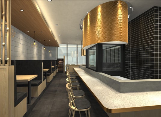 外観はスッキリとしたモルタルに生成りの暖簾を組み合わせることで明るく清潔感あるモダンなテイストで仕上げています。店内は御影石調のカウンターの中央にシンボリックな揚げ場を配することでライブ感を演出。内装は木を中心に、モルタル調の壁や黒のタイルなどを使い、暖かみがありながらもモダンで引き締まった空間にしています。