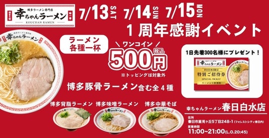 世界11カ国90店舗以上を展開、ラーメンのグローバルブランド、博多一幸舎や幸ちゃんラーメンを運営する、株式会社ウインズジャパンホールディングス(所在地 福岡県福岡市博多区、代表取締役社長 吉村 幸助 以下博多一幸舎)は?若男女問わず幅広い方達より「早い、美味い、また来たい!」、本場博多の町豚?(※)として支持いただき、2020年福岡県の初出店から、約4年で国内外17店舗を出店(2024年7月現在)している「幸ちゃんラーメン」ですが、この度、2023年7月14日にグランドオープンした「幸ちゃんラーメン 春日白水店」が開店1周年を迎え、日頃の皆様への感謝を込めて、1周年感謝イベントを開催させていただきます。イベント内容はラーメン全4種(博多豚骨ラーメン、博多背脂ラーメン、博多味噌ラーメン、博多中華そば)を500円でご提供(イベント期間:7/13~7/15)。またイベント期間中、ラーメンを頼まれたお客様には1日先着300名様に7/16以降から使えるラーメン無料券をプレゼントさせていただきます。ぜひ、この機会に「幸ちゃんラーメン 春日白水店」へ足をお運びください。(※町豚?:シンプルで毎日食べても飽きのこない、生活の中に溶け込んだ町のラーメン屋としています。)