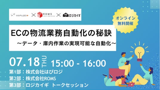 株式会社はぴロジ(本社:東京都港区、代表取締役社長:森憲史、以下はぴロジ)は、7/18(木)15:00より、株式会社ROMS(本社:東京都品川区、代表取締役:前野洋介、以下ROMS)と共催で無料ウェビナー「ECの物流業務自動化の秘訣 ~データ・庫内作業の実現可能な自動化~」を開催します。