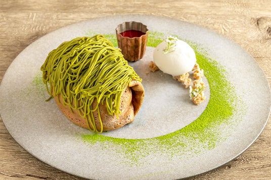◆桃と抹茶のモンブランクレープ クリームチーズのアイス 白ゴマとクルミのクランチ