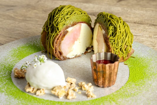 瑞々しい桃と濃厚な抹茶に、ほどよい甘みのマスカルポーネチーズのクリームを合わせ、クリームチーズのアイス、そしてアクセントに白ゴマとクルミの自家製クランチを添えました。もちもち食感に旬の素材を合わせたまるでフルーツ大福のようなひと皿です。