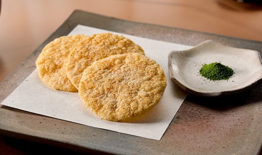 カラッと揚げたえびせんべいに、その時に採れた旬の京都野菜 堀川ごぼう・金時人参・宇治しいたけ をのせました。熟練されたこだわりの技法で旨味・香りを閉じ込め、3種の味覚に抹茶塩をブレンドすることで、素材の味を引き立てております。