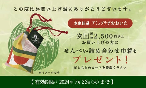 この再来店カードを持参し、次回税込2,500円以上お買い上げで本家佳長のせんべい詰め合わせが入ったオリジナル巾着をプレゼント!