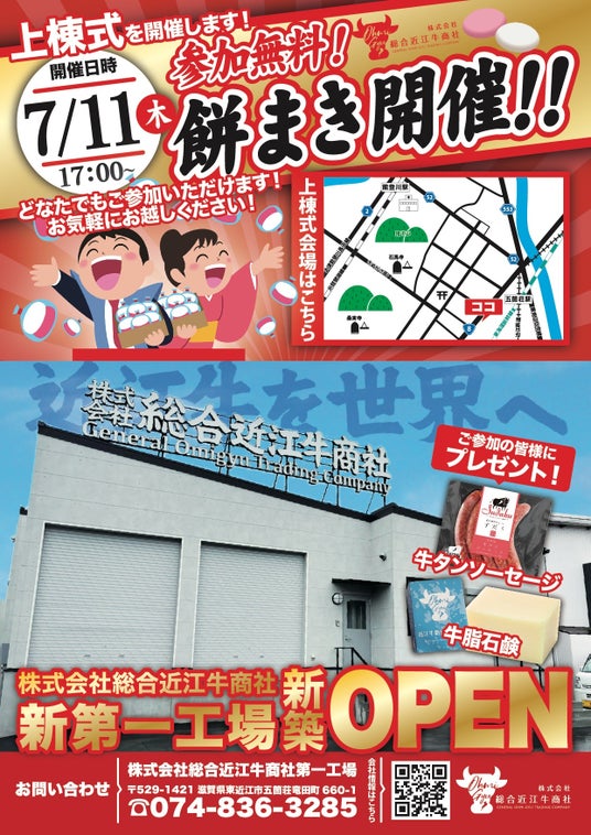 「焼肉すだく」を運営する株式会社総合近江牛商社(本社:滋賀県守山市、代表取締役:西野立寛)は2024年7月11日(木)新第一工場の新築オープンを記念して上棟式を開催することを決定いたしました。当日はどなたでもご参加いただけます。また、参加無料の餅まきを開催します。参加者の皆様には、先日、国際味覚審査機構の優秀味覚賞で1つ星を獲得した焼肉すだくオリジナルの牛タンソーセージや、総合近江牛商社が開発、販売している牛脂石鹸のプレゼントも予定しています。