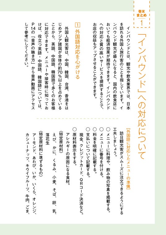 この「増補改訂版」においては、インバウンド対応と感染症対策もしっかりカバー。それぞれ留意しておきたい点が簡潔にまとまっています。