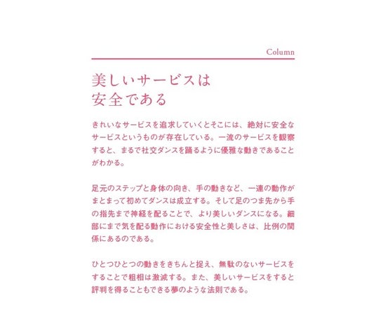 基本用語や動き方、立ち居振るまい、苦手意識を持つ人が多い電話やトラブル対応などの実用的な情報や、ホテルやレストランでのあらゆる接客対応についての「考え方」が、テーマごとにまとまっています。