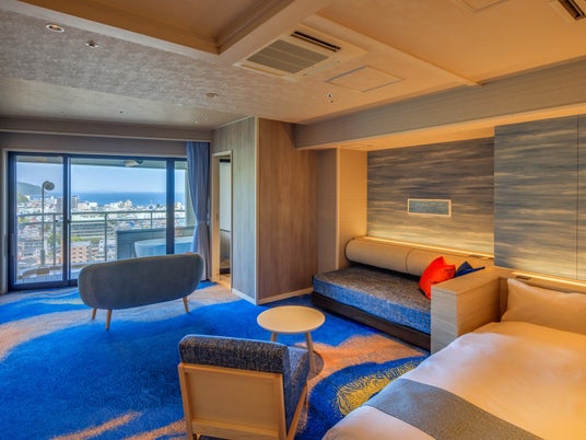 海と空のブルー基調としたデザインの客室は広さ44平方メートル 、ゆったり空間をお楽しみください。