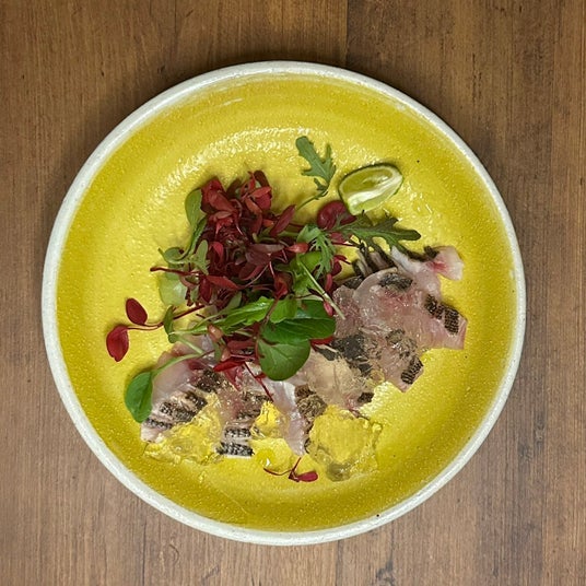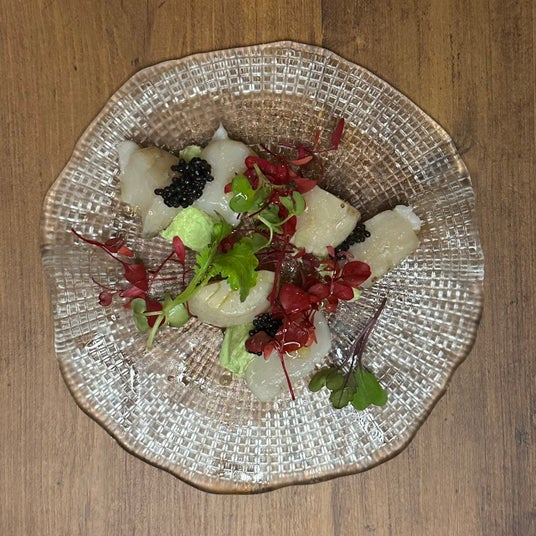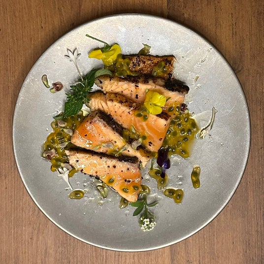 タスマニアサーモンとパッションフルーツ最高のサーモンを独自のスパイスでマリネし一瞬で薪火でタタキにしフレッシュなパッションフルーツと上質な塩のみで合わせたシェフオススメの1品