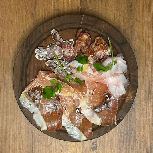 ハモンセラーノとサラミ盛り合わせ18ヶ月熟成のハモンセラーノとこだわりのサラミはワインに限らずあらゆるお酒に寄り添います