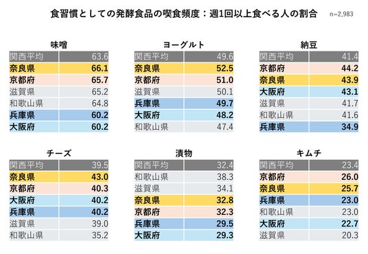 発酵食品を「週1回以上食べる」人は、京都府と奈良県が多く、大阪府と兵庫県は少ない。