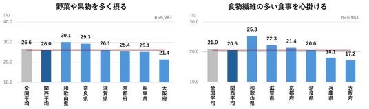 「野菜や果物を多く摂る」「食物繊維の多い食事を心がける」、いずれも1位は和歌山県、最下位は大阪府。