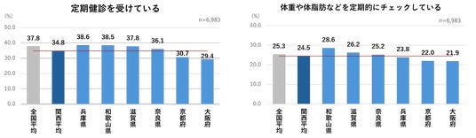 「定期健診を受けている」「体重や体脂肪などを定期的にチェックしている」がいずれも関西地方平均より高いのは滋賀県、奈良県、和歌山県、低いのは京都府と大阪府。
