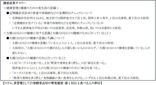 大腸(おなか)の健康を意識し、そのための食事、食材を求める食生活は、腸内環境の維持・改善のために大切です。一方、普段の食習慣・食文化の関係で食べている食品(特に発酵食品など)が、結果的に大腸(おなか)の健康に良い影響を与えているといったことがあります。そのため、今回の調査では、大腸(おなか)の健康のための食事としてだけではなく、「食習慣としての発酵食品別の喫食頻度」についても調査しました。