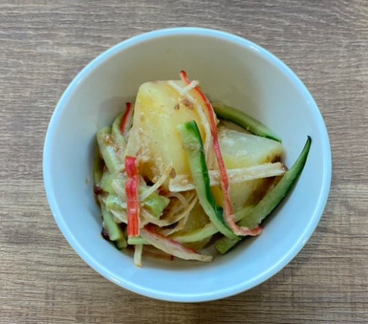 ジャガイモとかにかまのぐるりこゴマドレッシング和え(小鉢)ゴマドレッシングに『タマネギぐるりこ』を加えたドレッシングのサラダ小鉢。胡麻と『タマネギぐるりこ』の香ばしさがアクセントです。