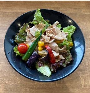 夏野菜の豚しゃぶサラダうどんドレッシングに『タマネギぐるりこ』を使用し、夏らしくさっぱりと食べられます。香ばしい香りが特徴です。
