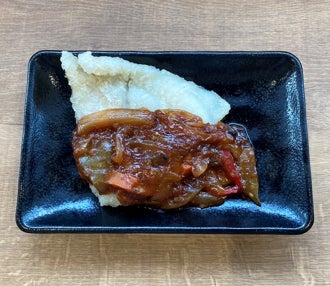 白身魚のタマネギぐるりこあんかけ白身魚のから揚げに、ピーマン、パプリカ、タマネギなどの野菜がたっぷりと入った中華風あんをかけたメニュー。あんに『タマネギぐるりこ』を加えることで、香ばしさと食欲をそそる色味を付与しています。しっとりとした魚に『タマネギぐるりこ』あんが良く合います。
