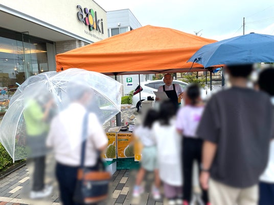 「ドリアンパーティー」は、なかなか手に入れることのできないドリアンの魅力を発信するため、フルーツショップ青木の一部店舗限定で不定期に実施している、フルーツ専門店ならではのイベントです。過去開催時には、これを機に初めてドリアンにチャレンジする方や、ドリアンが大好きで何度も来店し購入する方がいたりと、普段接する機会が少ないドリアンを「見る」「食べる」体験ができるイベントとして、お客様より好評いただいています。