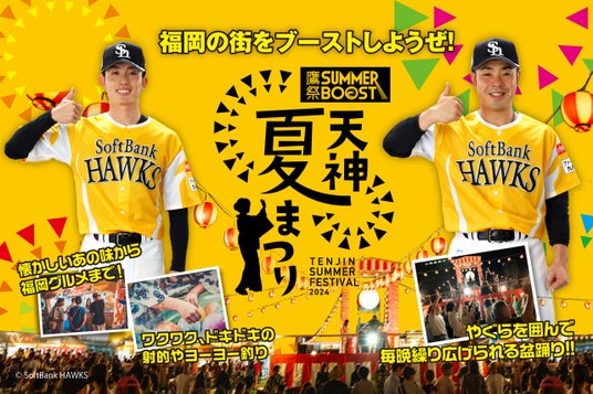 この夏、話題騒然の「鷹祭 SUMMER BOOST meets 天神夏まつり」(7月19日(金)~8月18日(日)福岡市役所西側ふれあい広場)(主催:天神夏まつり2024実行委員会(詳細は下記)、事務局:株式会社サエキジャパン/本社・福岡市中央区清川、代表取締役社長・佐伯岳大)の屋台グルメや縁日・ライブ出演者など最新を公開いたします。