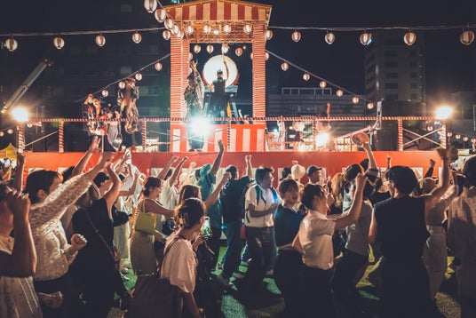 会場で毎夜繰り広げられる盆踊りを盛り上げてくれるのは「野和太鼓」のメンバー。炭坑節といった昔なじみの曲に加えて、ポップスも使った新しいタイプの盆踊りが楽しめます。