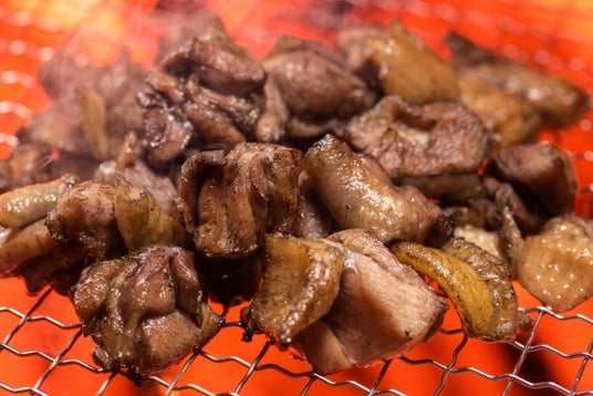 創業昭和9年「肉の勉強屋」の食事処「西新初喜」が提供する鶏の炭火焼き。外はカリッと中はジューシー。