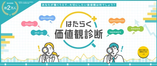 はたらく価値観診断は、個人の働く価値観や仕事に対するモチベーションを理解するためのツールであり、仕事に関する49問の質問に答えていくことで、あなたが大切にしたい、仕事に対する価値観・傾向やこだわりを27種類の中から見つけることができます。