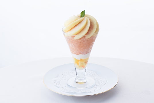 トップのフレッシュな桃そのものを楽しんだら、バニラアイス、ほんのり洋酒が効いた白桃のグラニテ、白桃ソルベ、クリーム、そして桃のシロップで和えた角切りの果肉と、最初から最後までさまざまな形で、旬の桃を存分にご堪能いただける一品です。
