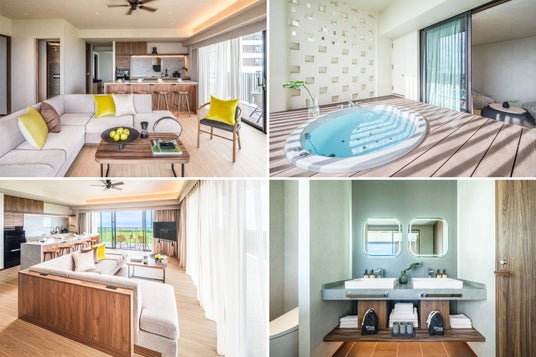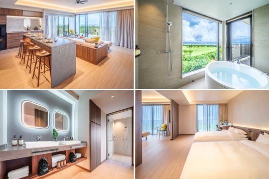 121室ある客室すべてにテラスを完備。海を一望できるオーシャンビュータイプ、ジャグジー付きのお部屋、ジャパニーズモダンな畳のある和洋室、バリアフリータイプ、グループステイを可能にするバンクベッド(2段ベッド)タイプなど、全21タイプの多彩なデザインからお選びいただけます。最上階には300平方メートル 超のサウナが付いたメゾネットタイプのスイートルームもご用意。究極のリラックス体験をご提供します。