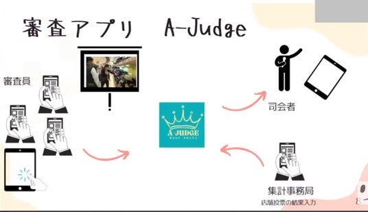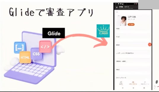 人材育成部では、脱!Excel&紙文化を目指し、ノーコードツールのGlideを使用した接客コンクール審査用アプリを開発。これまでは審査員が紙に記入し、事務局がExcelに転記し集計する手法を用いていたが、開発されたアプリの「A-JUDGE」では、点数を入力するだけで集計、グラフ作成が可能となり、人・紙・時間の削減と手入力による人為的ミスをなくすことに取り組みました。
