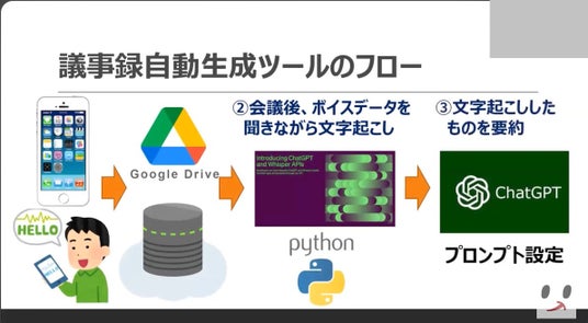 議事録作成をOpenAIを使って文字起こしを行い、ChatGPTに要約を任せることで業務時間を9分の1まで短縮されました。スピード、クオリティともに部署内での評判は上々で、今後はよりシンプルに少ないツールでの実装に向けて改善を続けられています。