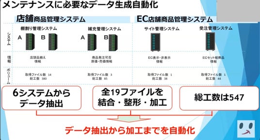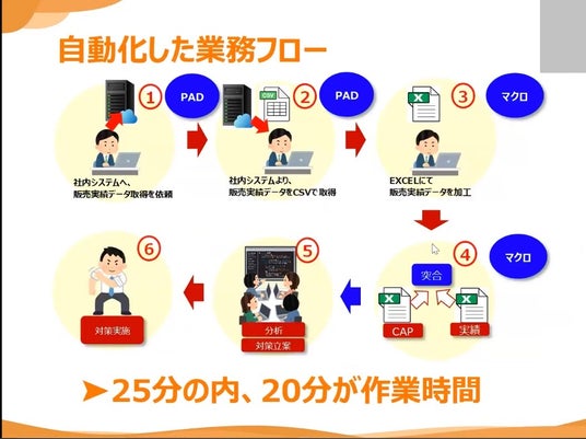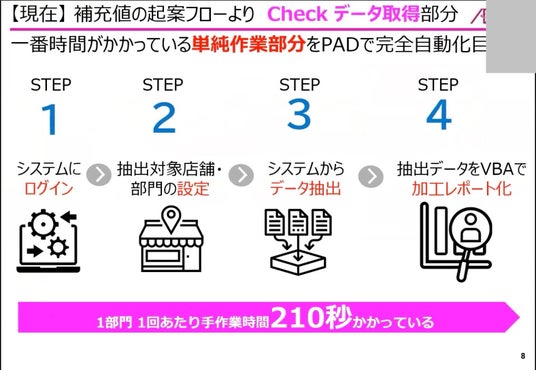 小売業最大の投資である仕入れ。膨大なデータの取得や加工が手作業で行われており、分析や対策の実施に時間が割けていない現状がありました。そこで、PADを用いて販売実績データ取得、加工を自動化を実現し、お客様の要望に応えられる商品の仕入れに時間を割くために、今後も改善を続けていかれるそうです。