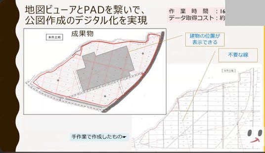 土地の形状や隣地との位置関係、地番を示した公図。大きなショッピングセンターを作る際、何枚かの公図を紙ベースで法務局から購入したものを、手作業で切り貼りして作成していたそうです。この骨が折れる作業をデジタルで効率化。MAPPLE法務局地図ビューアで地図を表示、Power Automate Desktopで画像取得、トリミングまでを自動化し作業時間を16時間から1時間へと削減し、さらに紙ベースの公図を購入するコストもカットした。