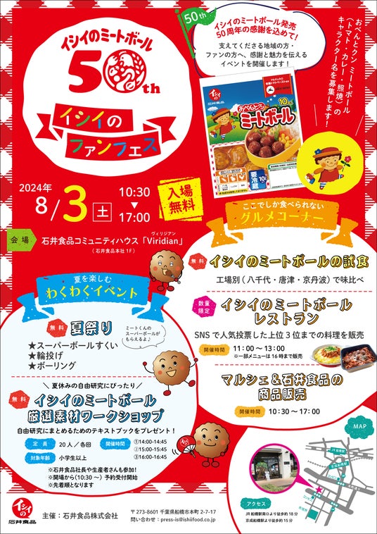 石井食品の『イシイのミートボール』は、2024年に50周年を迎えました。日ごろから応援してくださるみなさま、長年支えてくださる地域のみなさまへ感謝を伝えたいという思いから、本イベントの開催に至りました。2023年3月に第1回「石井食品ファン交流会」を石井食品船橋本社で、2023年8月には京丹波工場にて第2回「石井食品ファン交流会」を開催し、多くのファンの方にご応募いただきました。今回のファンフェスは、ファンの方はもちろん、地域の方へも感謝を伝えるべく、石井食品船橋本社では、入場無料の夏祭りイベント、各工場エリア周辺では催事イベントを開催します。