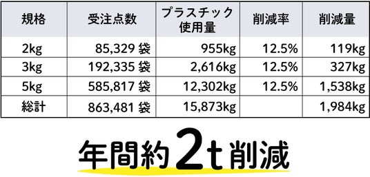 2023年度の受注実績に基づいて算出すると、プラ削減率は12.5%となり、年間で約2トンのプラスチック削減になります。また、今回採用した素材「e-PE」は、生活クラブが独自に使用不可と定める酸化防止剤などの添加剤が使用されていないことを、包材メーカーと確認済みです。プラスチックの使用量を減らすだけでなく、素材自体の安全性にも配慮しています。