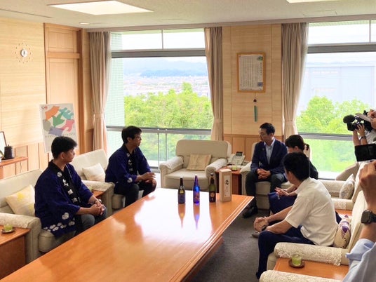 右から2番目:掛川市 久保田崇市長左から2番目:掛川市 石川紀子副市長一番右 :掛川市議会 藤原正光総務委員長写真中央 :山中久典 遠州山中酒造代表取締役兼杜氏写真左 :森利博 遠州山中酒造営業部長