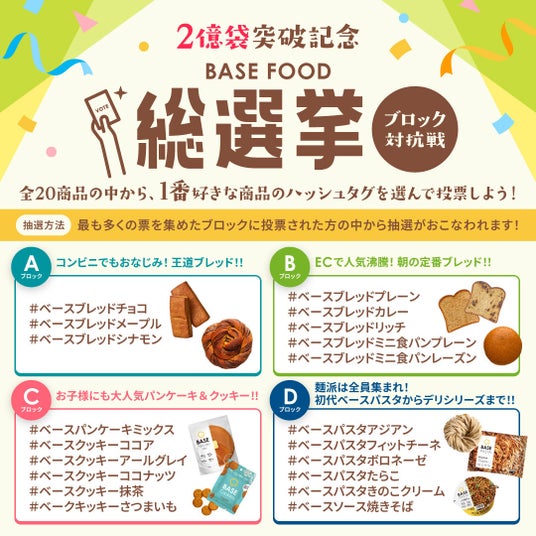□概要:BASE FOODシリーズ20商品の中から1番好きな商品を投票。抽選で200名様にBASE FOODオリジナルグッズをプレゼント