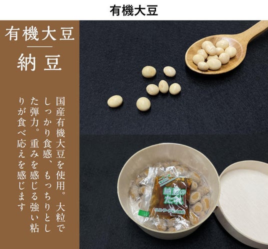 有機大豆有機JAS法に則り原則、無農薬、無化学肥料で栽培されている青森県産の有機大豆「おおすず」を使用。大粒でしっかり食感、もっちりとした弾力。重みを感じる強い粘りが食べ応えを感じます。