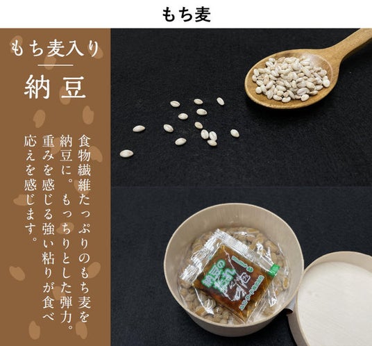 もち麦入り当社工場のある兵庫県福崎町の名産もち麦を使用。食物繊維たっぷりのもち麦を納豆に。もっちりとした弾力。重みを感じる強い粘りが食べ応えを感じます。