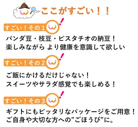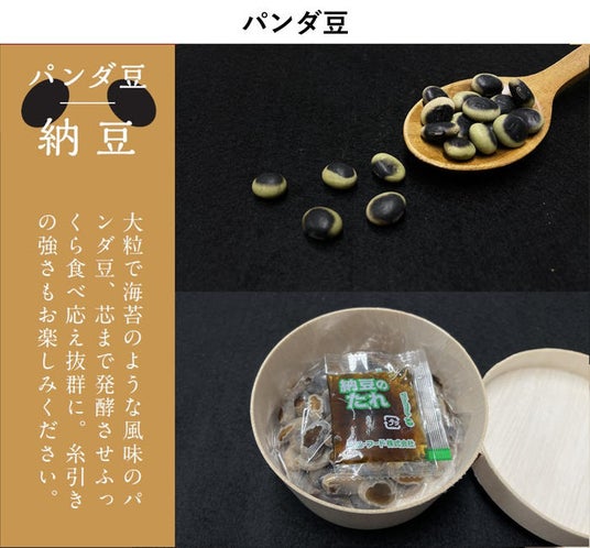 パンダ豆大粒で海苔のような風味のパンダ豆、芯まで発酵させふっくら食べ応え抜群に。糸引きの強さもお楽しみください。